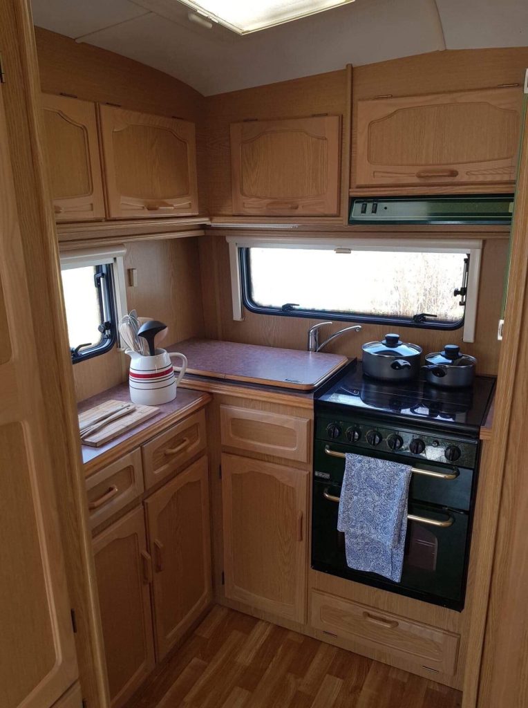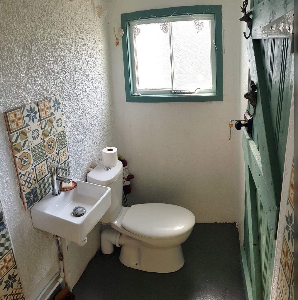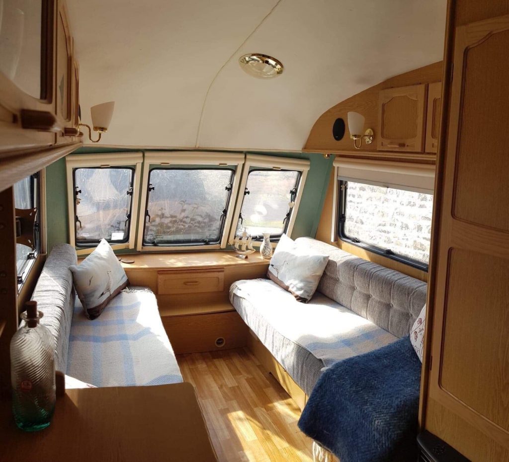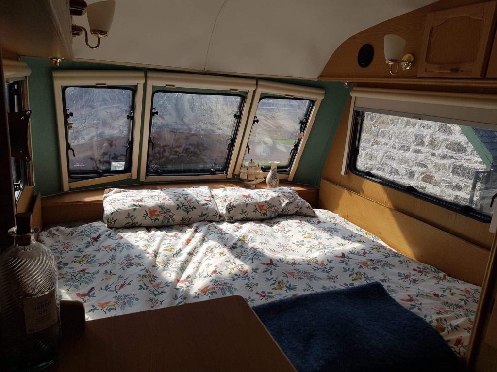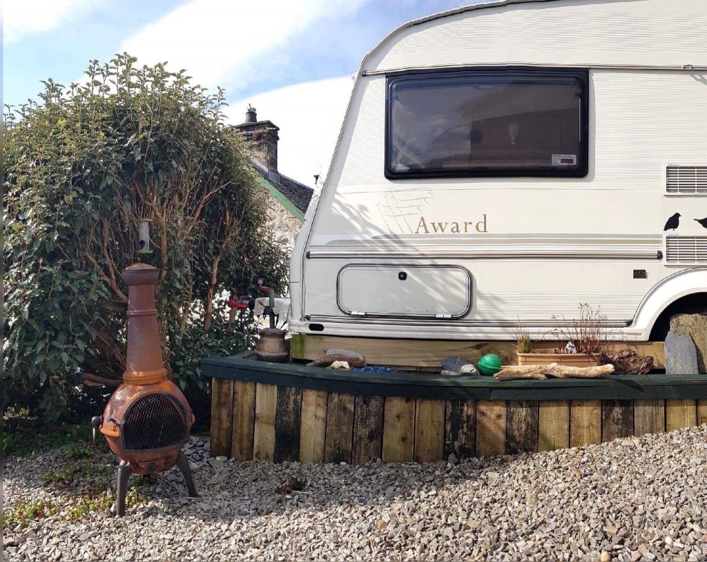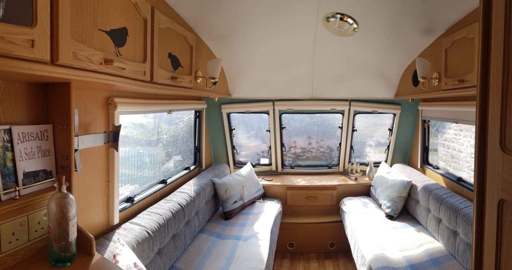 The caravan sits on its own patch, next to Rhu Cottage, but fully enclosed and with a private gravelled space to sit outside, with views to the sea. A seperate and private outhouse for your exclusive use has a fully plumbed toilet and efficient shower.